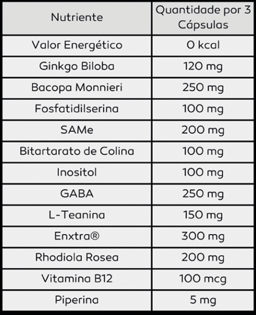 Bacopa Monnieri: 250 mgGABA: 250 mgEnxtra®: 300 mgRhodiola Rosea: 200 mgSAMe: 200 mgGinkgo Biloba: 120 mgL-Teanina: 150 mgFosfatidilserina: 100 mgInositol: 100 mgBitartarato de Colina: 100 mgVitamina B12: 100 mcg (0,1 mg)Piperina: 5 mg